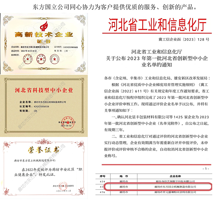 恭賀東方國(guó)立機(jī)械制造有限公司榮獲2023年第一批"河北省創(chuàng)新型中小企業(yè)證書(shū)",在此前,我司于2022年5月2號(hào)榮獲“河北省科技型中小企業(yè)”證書(shū)、2022年10月18日榮獲“高新技術(shù)企業(yè)證書(shū)”、2022年12月被評(píng)為廊坊市安次區(qū)“職業(yè)健康企業(yè)”。